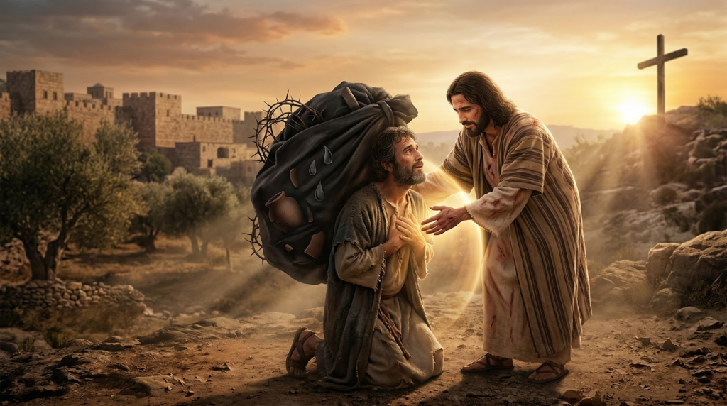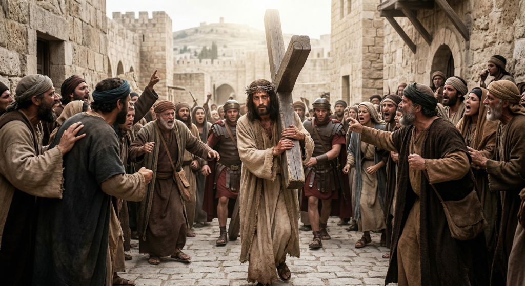 2000年前、エルサレムの外れ。一人の男が重い十字架を背負い、人々の罵声の中を歩いていました。多くの人は彼を「呪われた罪人」だと思って見ていました。