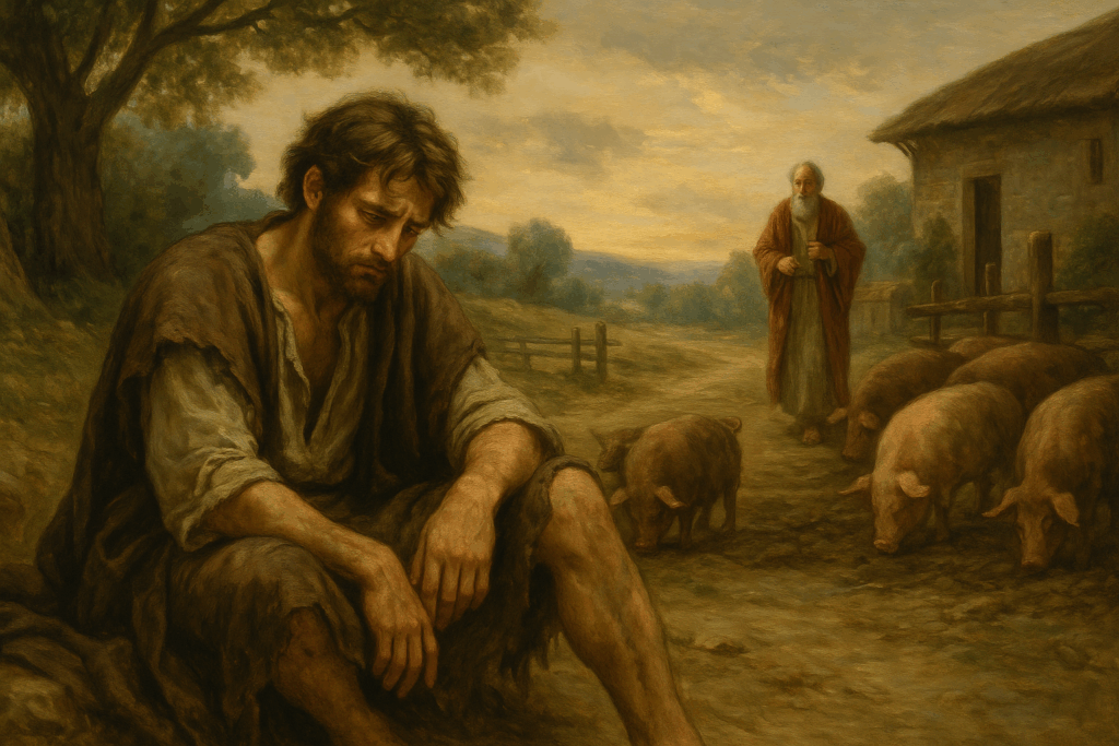 飢えに苦しむ中で、自分の罪を悟り、「父のもとに帰って謝ろう」と決心します。