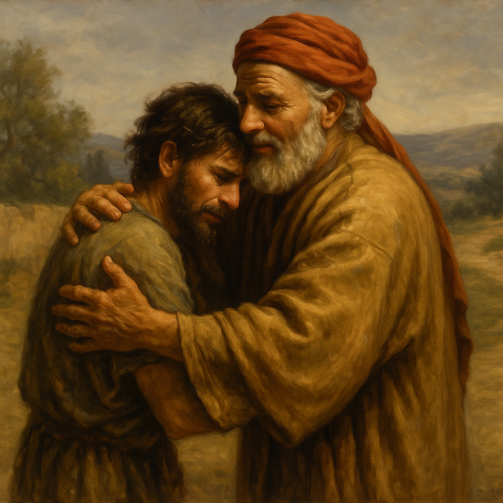父は息子を責めず、遠くから見つけて走り寄り抱きしめます。これは“失敗しても見放さない愛”の象徴です。
