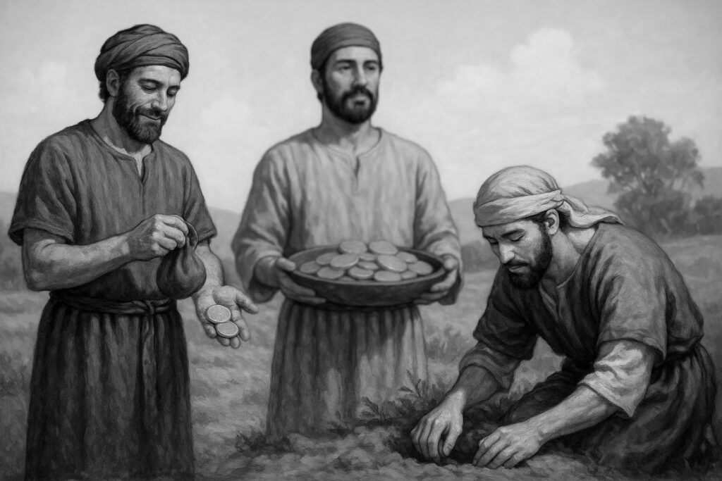 2人はそのお金を使って増やしましたが、1人は恐れて土の中に隠しました。
