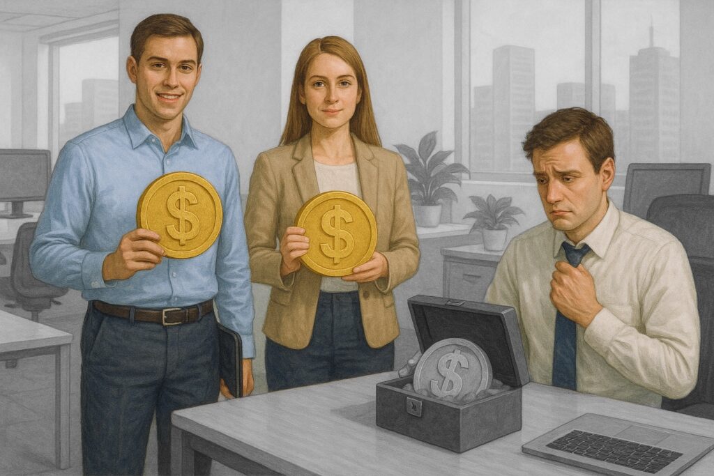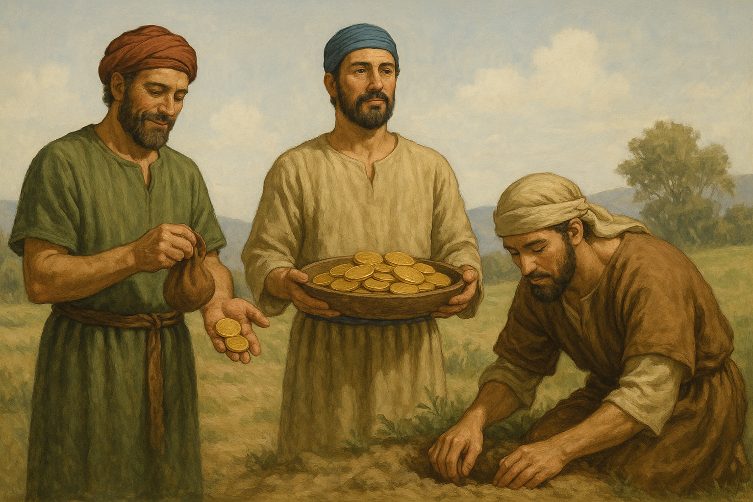 ある主人が、家を離れる前に3人のしもべにお金(タラント)を預けます。