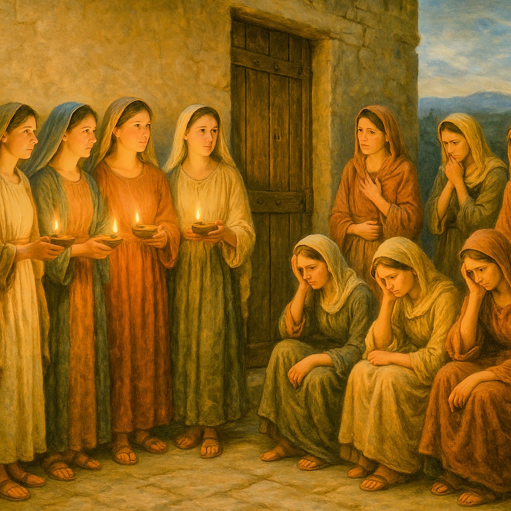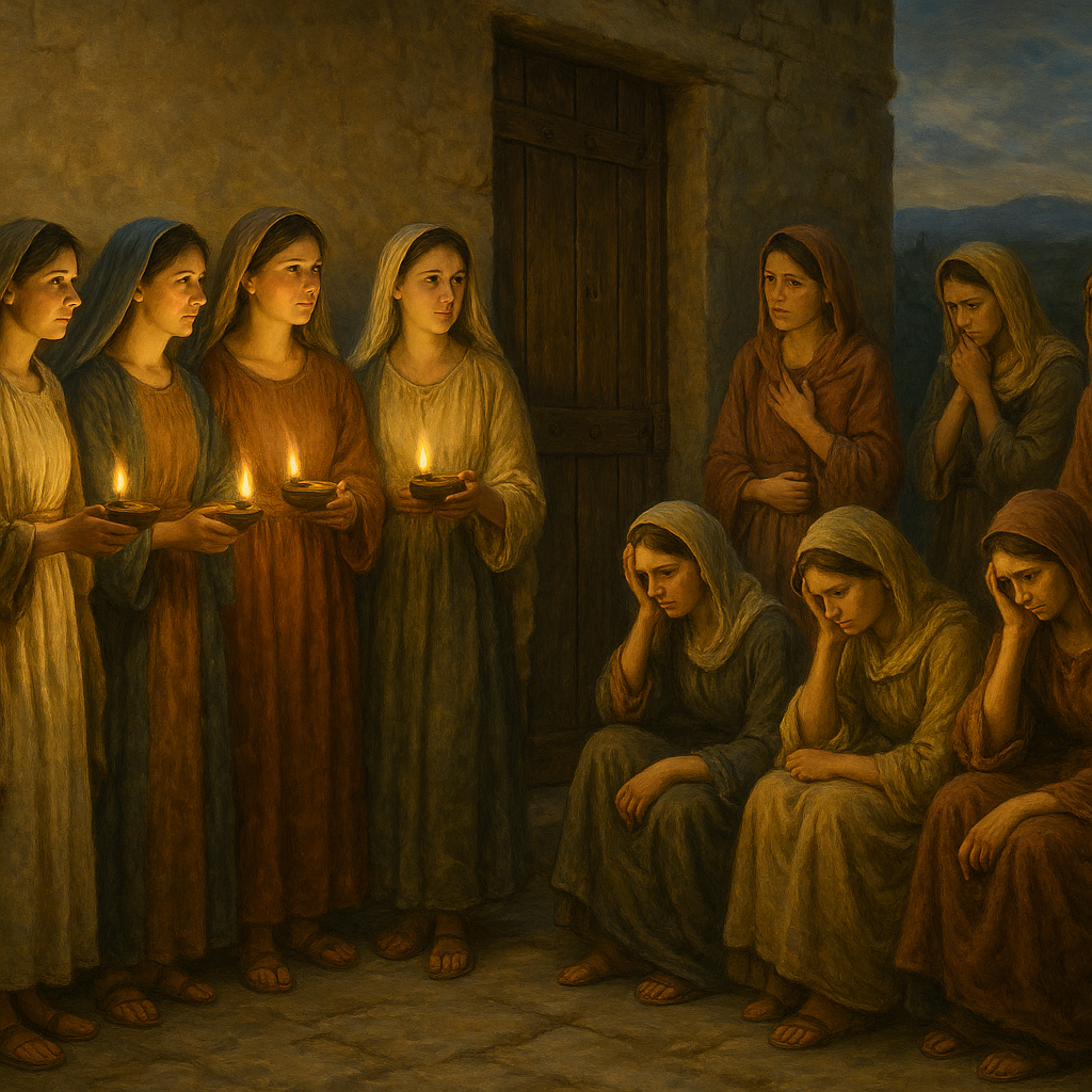 花婿を迎えるために待っていた十人の娘のうち、五人は油を用意した賢い娘、もう五人は準備を怠った愚かな娘でした。