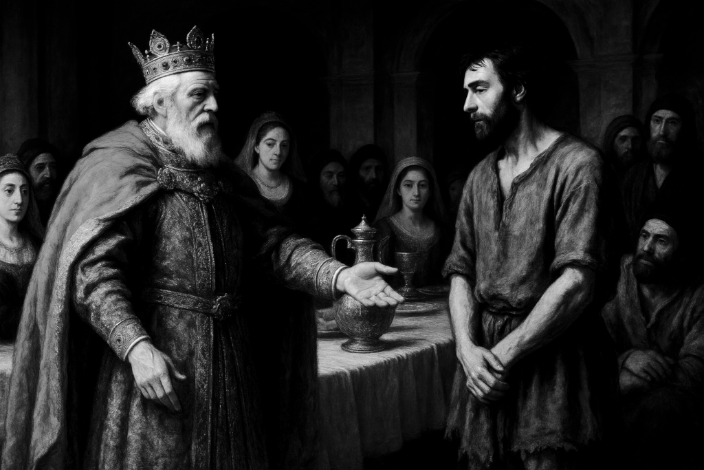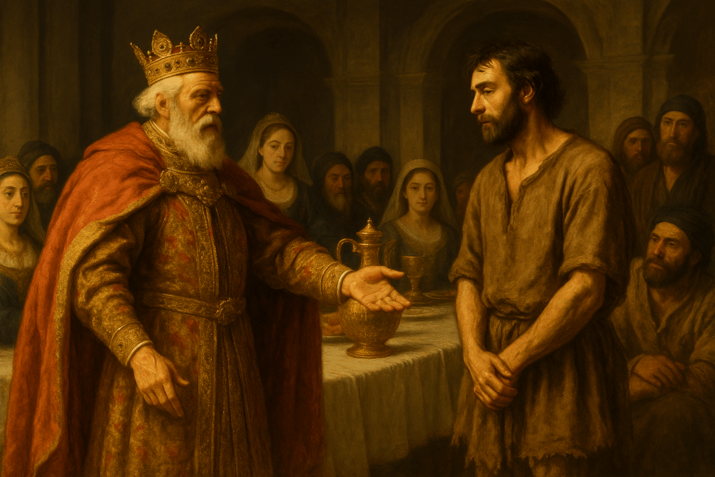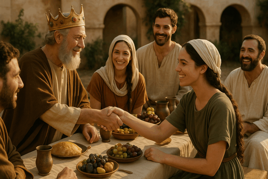 怒った王は彼らを罰し、今度は町の大通りにいる善人も悪人も区別なく招き、宴は満たされます。