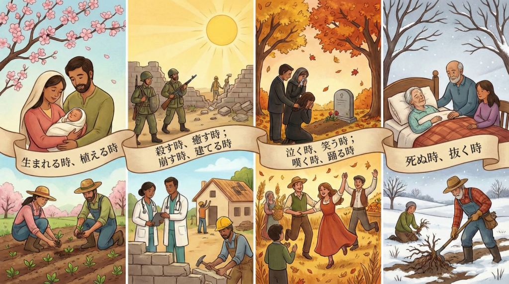 「何事にも定まった時があります。 生まれる時、死ぬ時、植える時、収穫の時、 殺す時、病気が治る