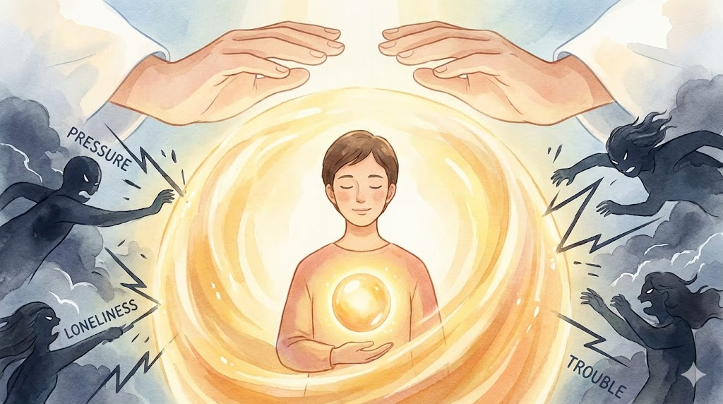 日々の強烈なプレッシャーや深夜の孤独感など、心を蝕むあらゆる力から、神様があなたの存在そのものを死守してくださるという強力な保証です。